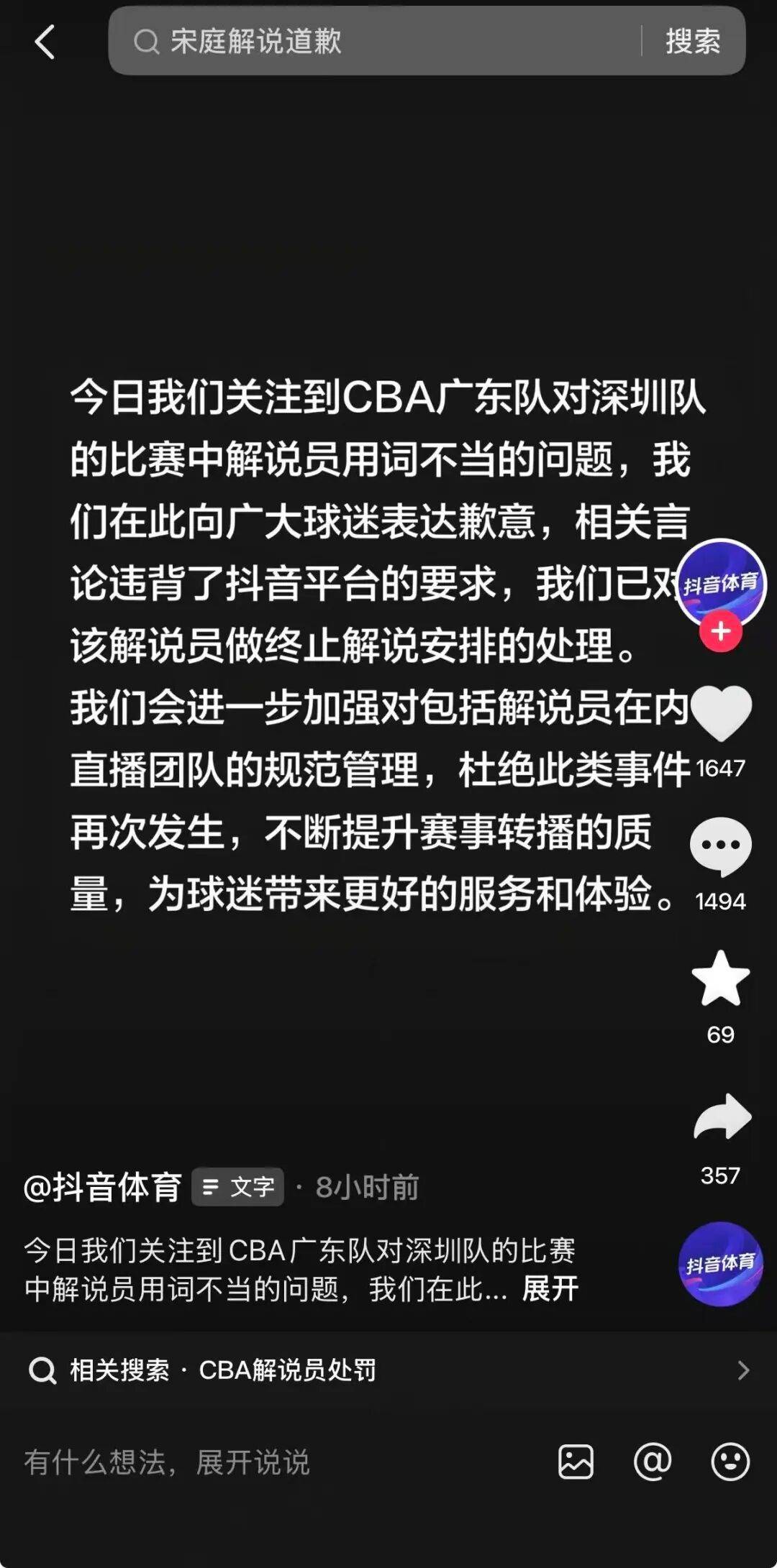 体育比赛直播_足球_波胆_买球_篮电竞_在线投注CBA解说员出现争议言论抖音体育深夜致歉:用词不当对该解说员终止安排