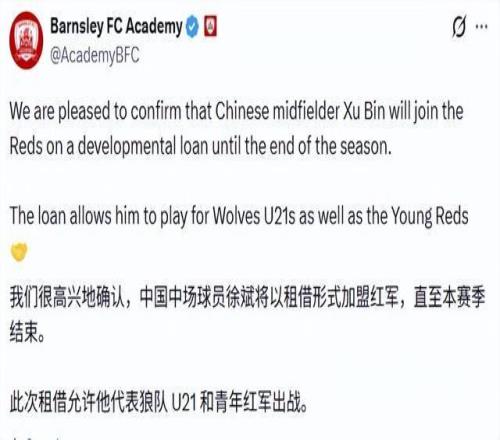 相比于狼队的官宣,巴恩斯利这边发布徐彬租借加盟消息的,却是巴恩斯利足球俱乐部学院。