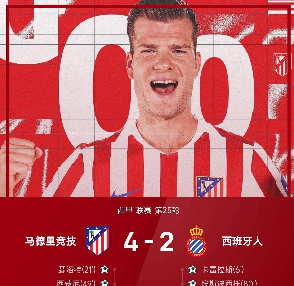 尽管西班牙人在第80分钟由埃斯波西托远射扳回一城,但已无力回天。 最终,马德里竞技以4-2完成一场精彩的逆转,全取三分。