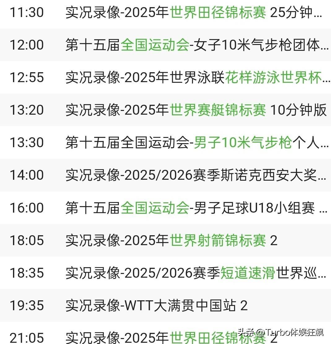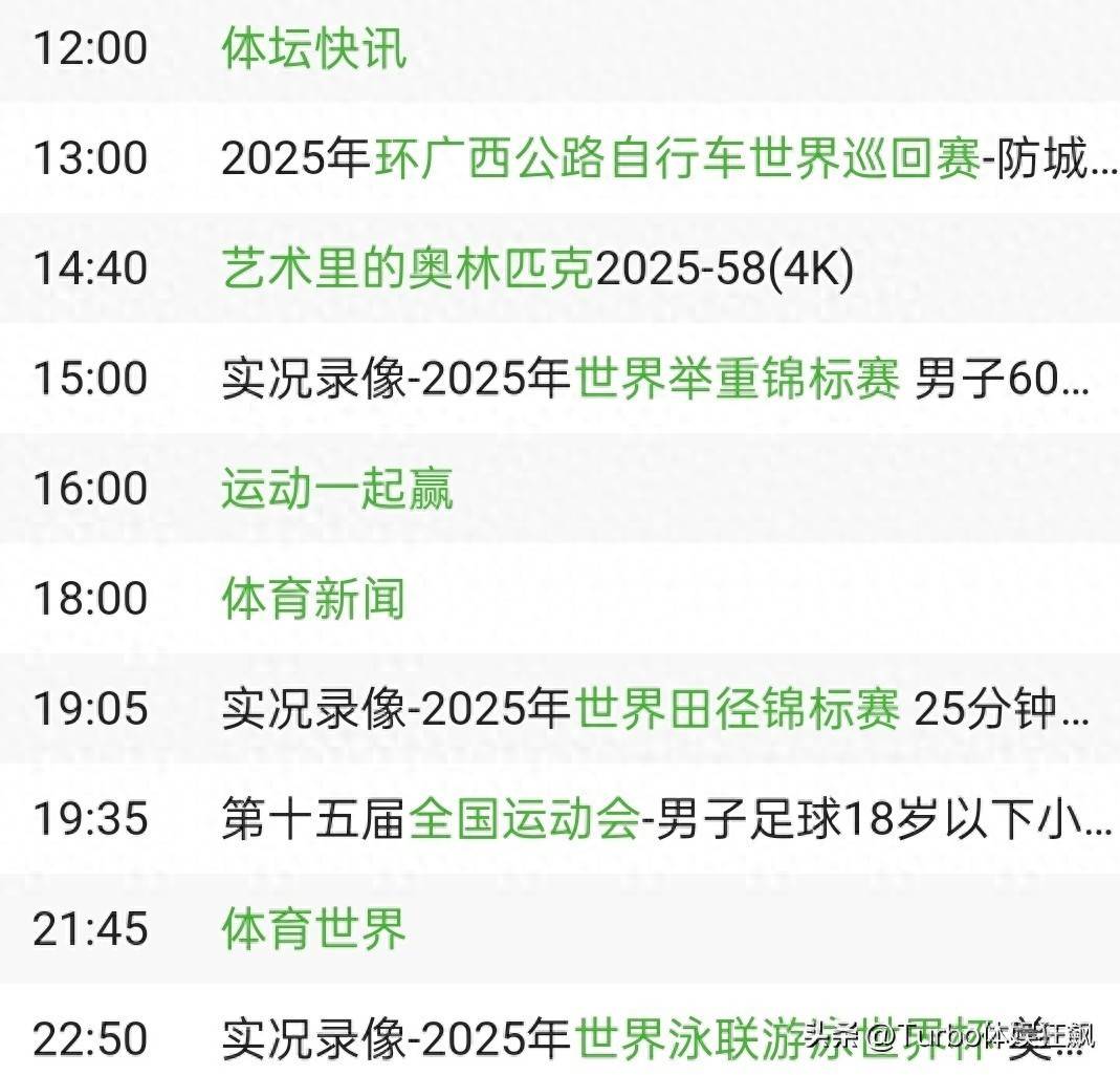今日节目单显示,央视体育频道为广大体育爱好者提供了多样化的观赛选择,从现场直播到精彩回放,覆盖了足球、篮球、乒乓球、射击、自行车等多个体育项目。返回搜狐,查看更多