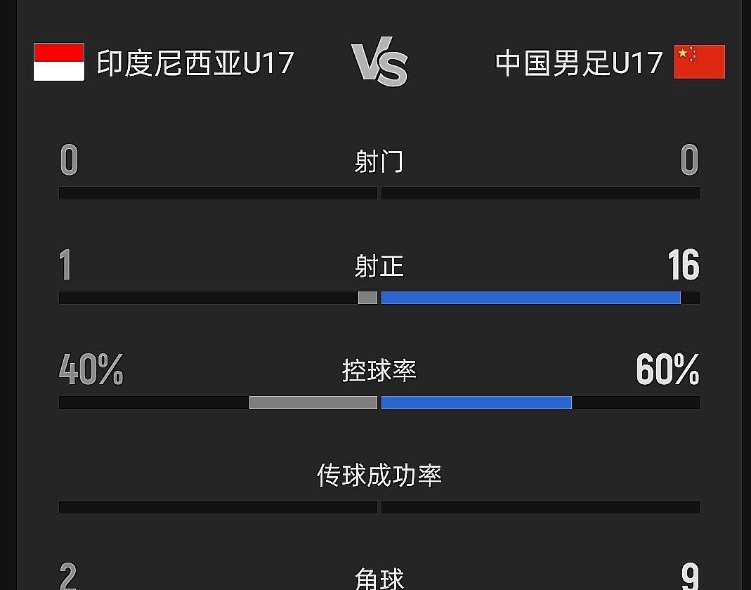即便比赛进入补时阶段,中国队仍在进攻,并在第92分钟由伊力洪推射远角,将最终比分锁定在7-0。 从技术统计看,中国队控球率达到64%,全场20次射门中有16次射正,而印尼队全场仅有1次射正。 有媒体形容,这场面如同“战术降维打击”。