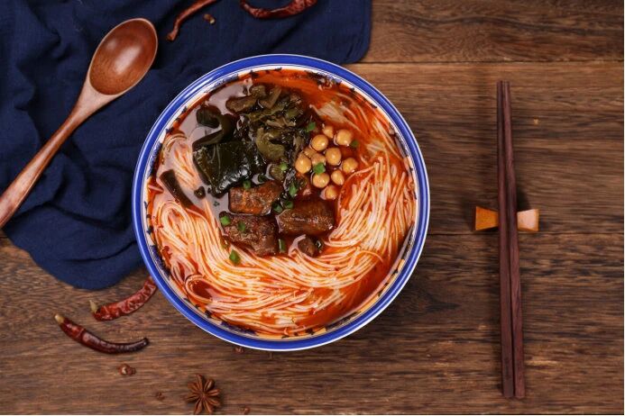 “一清二白三红四绿”的讲究,细米粉在滚烫的骨汤里一冒,配上牛肉、肥肠、笋子浇头,麻辣鲜香一口入魂,看球前来一碗,直接把精气神拉满!
