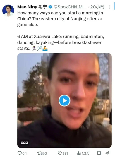 “美丽的社区,宛若圣境”“那位在双杠上的竟然是位老爷爷”“这是哪里?看起来生活很宁静”……在加拿大外教卡斯拍摄的中国人晨练视频下,不少海外网友点赞、评论。视频还得到了外交部发言人毛宁和中国驻德国大使馆、中国驻佛罗伦萨总领馆等官方账号的点赞转发。中国驻加拿大大使馆转发媒体专访视频并点评:“友善的人民、活力的晨练、便利的免签政策,都是造访中国的理由。”