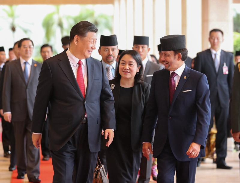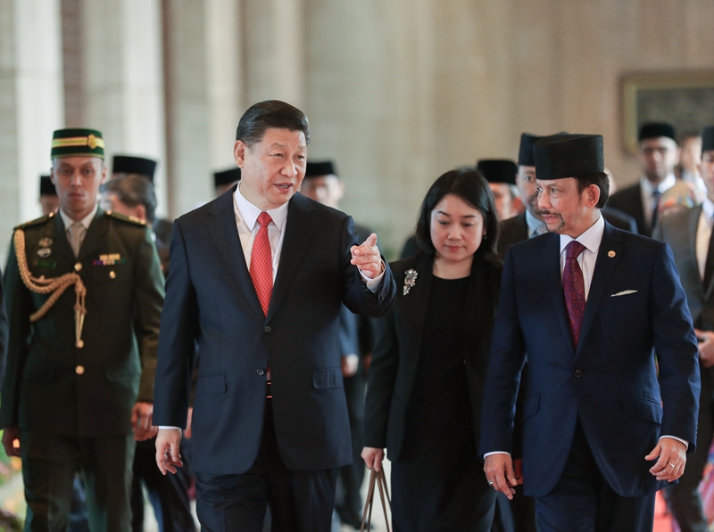 11月19日,国家主席习在斯里巴加湾同文莱苏丹哈桑纳尔举行会谈。这是习同哈桑纳尔亲切交谈。新华社记者 鞠鹏 摄