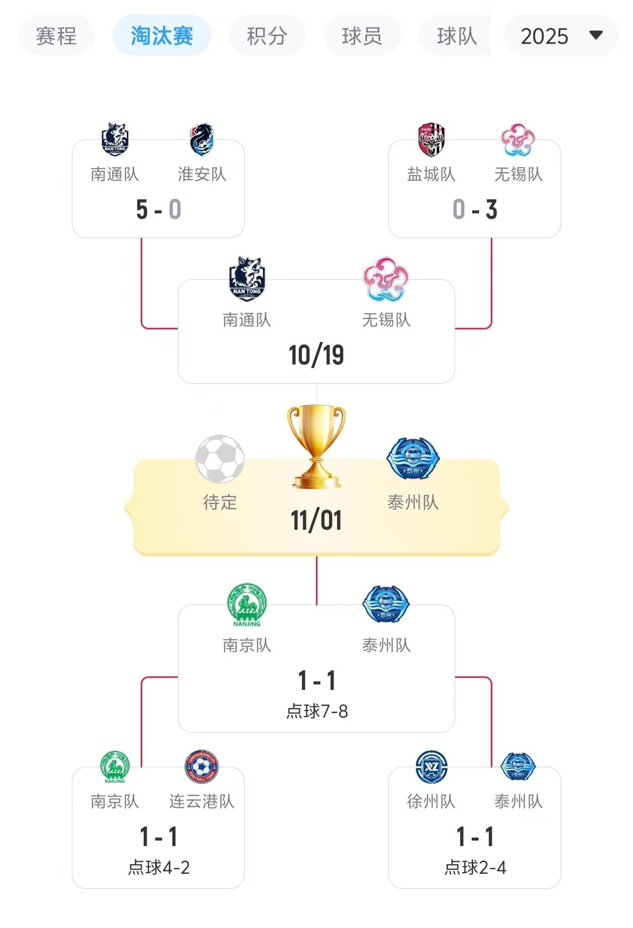 泰州队的过程和结果,和南京队何其相似,他们客场作战,对战徐州队,在先丢球的情况下,1比1扳平比分,进入点球大战,最终点球大战4比2(总比分5比3)战胜徐州队,晋级四强,由于客场作战,含金量更高。